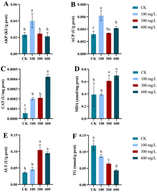 Effects of ammonia stress on non-specific enzyme activity in E. j. sinensis. (A) AKP in hepatopancreas; (B) ACP in hepatopancreas; (C) CAT in hepatopancreas; (D) MDA in hepatopancreas; (E) ALT in hepatopancreas; (F) TG in hepatopancreas. Different letters (a, b, c, d) indicate significant differences (p < 0.05).