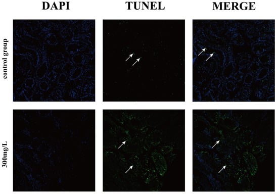 The fresh hepatopancreatic tissue was sliced, then dried and covered with protease K working solution before being placed in an incubator at 37 °C for 22 min. The tissue was washed and decolorized three times for 5 min each using PBS. To create the TUNEL detection solution, TDT enzyme, dUTP, and buffer were mixed at a ratio of 1:5:50 and incubated at 37 °C for 2 h. After incubation, the slices were washed with PBS three times for 5 min each, then DAPI staining solution was added, and they were then incubated in the dark for 10 min. The sections were washed three times for 5 min each with PBS and then sealed with anti-fluorescence quenching before being dried. Finally, the sections were observed under a fluorescence microscope (Leica, Germany) and the images were collected [27].