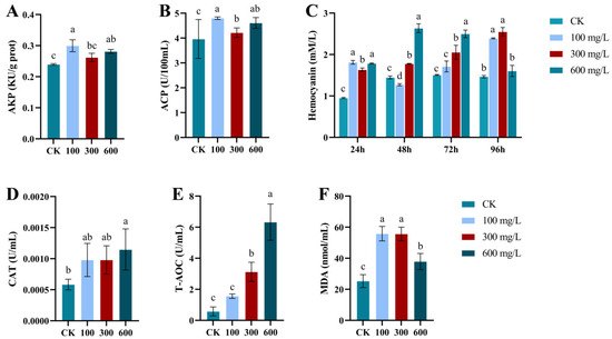 Effect of ammonia stress on non-specific enzyme activity in E. j. sinensis. (A) AKP in hemolymph; (B) ACP in hemolymph; (C) hemocyanin content; (D) CAT in hemolymph; (E) T-AOC in hemolymph; (F) MDA in hemolymph. Different letters (a, b, c, d) indicate significant differences (p < 0.05).
