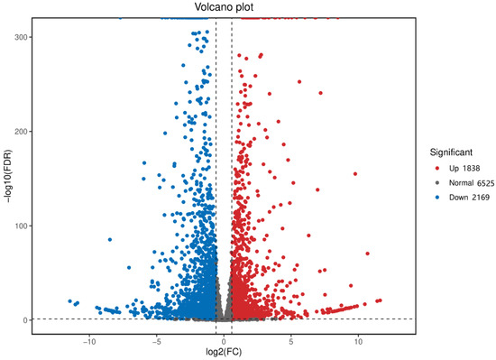 A volcano plot was generated based on these results, showing 4007 differentially expressed genes (DEGs) between the control and treatment groups, with 1838 upregulated and 2169 downregulated genes (Figure 5). In the volcano plot, red dots represent upregulated genes, blue dots represent downregulated genes, and gray dots represent genes with no significant differential expression [70].