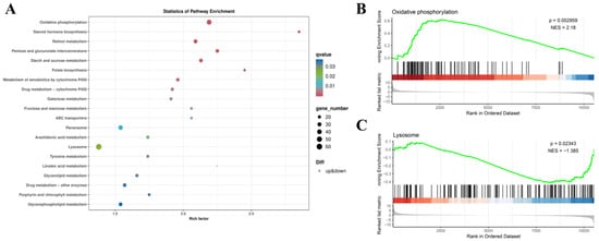 The results of KEGG pathway enrichment are illustrated through the KEGG bubble diagram (Figure 7A), displaying the top 20 pathways with the lowest q-values. Notably, the oxidative phosphorylation (ko00190) and lysosome (ko04142) pathways were of particular interest. Gene set enrichment analysis (GSEA) [71] revealed that oxidative phosphorylation was upregulated (Figure 7B), while the lysosome pathway was downregulated (Figure 7C).