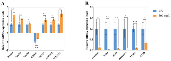In the oxidative phosphorylation pathway, the core genes are predominantly associated with NADH dehydrogenase subunits (Ndufb11, NuoB, Ndufs4, Ndufv2, Ndufa5, etc.), cytochrome c oxidase subunits (COX7A, COX11, COX6B, COX4, etc.), and the mitochondrial ATP synthase complex (ATP5MF, ATP6V1F, ATPeV0E, etc.) (Figure 8A). Seven genes were randomly selected for validation of differential expression, showing upregulation of Ndufs4, Ndufv2, Ndufa5, COX6A, ATP5MF, and ATPeV0E, while COX11 was downregulated (Figure 9A). Notably, Ndufs4 and ATPeV0E exhibited upregulation by 2.13- and 2.25-fold, respectively, consistent with the KEGG bubble plot trends in the transcriptome. The upregulation of most genes is speculated to enhance ATP production through the oxidative phosphorylation pathway, maintaining immune efficiency. Six immune-related genes—crustin-2, lectin, ALF3, chitinase 3, PPAF2, and CTSB—were also randomly selected, with most showing downregulation by more than two-fold (Figure 9B). This downregulation likely contributes to the observed repression of the lysosomal pathway.