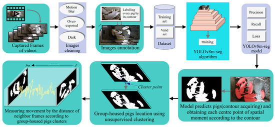 We developed an approach for continuously monitoring group-housed pigs via the following steps: (1) The deep learning model YOLOv8m-seg is used to automatically and precisely detect pigs in images and acquire points that consist of their body contours. (2) According to the pig contour points, the geometric spatial moment algorithm is used to quantitatively summarize the location of every pig as a single point, and the locations are separately determined on the basis of the detection results for each frame. (3) After every quantified pig’s location is obtained, the agglomerative clustering algorithm is applied to characterize the movement of the quantified pigs in terms of a single center point, and an improved Euclidean distance algorithm is used to increase the robustness of this method. We successfully deployed this automatic approach to obtain daily monitoring information on pig movement.
