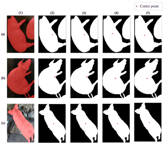 Distinguishing the center point of a predicted pig contour. The images in the columns are described as follows: (1) prediction image, (2) mean coordinate, (3) least squares, (4) signed area, and (5) spatial moment. The different pig behavior patterns depicted in each row are as follows: (a) lying, (b) sitting, and (c) standing.