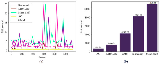 To select a suitable algorithm among the candidates, we obtained frame-by-frame pig center point data from a test video via the aforementioned moment method. The test video duration is 1 minute, and it was obtained from a 15 min video; it contains pigs lying down and continuously moving. The algorithms individually processed the data, and the runtime of each algorithm was recorded. The corresponding results are shown in Figure 5a. To display each algorithm’s runtime for each frame of the test video, a threshold was set to identify excessively long runtimes, which were then modified to 25 milliseconds when the figure was drawn. The data show that the AC and DBSCAN algorithms achieved fast performance; the remaining algorithms were unstable and occasionally had fast performance over a few frames. Figure 5b shows the total time consumed by the algorithms with the test video. The process was repeated 30 times in our experimental environment, and the results are presented as the average of the 30 data points. The bar graph displays the gradient disparity among the total time consumed by each clustering algorithm. The AC algorithm required the least time, whereas the mean shift algorithm required the longest time. We ultimately considered the AC algorithm to be a steady and fast clustering algorithm and therefore applied this algorithm in our experiments.