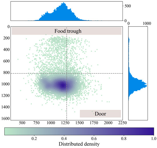 All the detected positions from 13 May to 8 July are shown in Figure 6, which further shows the calculated positions of the detected pig herd. The x and y axes of Figure 6 represent the pixel coordinates of the image; the points are distributed across most of the pigpen area, reflecting that the pigs moved freely in this area. The color bar’s distributed density ranges from 0 to 1, such that the deep color area represents the pigs’ favorite resting place. The upper and right subfigures show histograms of the cumulative coordinate point distributions. The upper histogram shows smoother changes than the right histogram does. In the right histogram, higher values are distributed mainly in the lower part of the figure, and the magnitude of the change is greater than that in the upper histogram. During consecutive weeks of monitoring, pigs spent most of their time in the inner corner, close to the back wall of the pigpen.