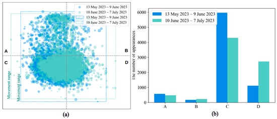 Changes in the position information over time: (a) Pigs positioned during two periods from 13 May to 9 June 2023 and 10 June to 8 July 2023. (b) The statistical variation in the number of pigs appearing in different regions during the two periods.