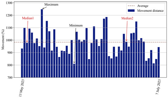 Figure 8 shows the summed volume of distance moved by the pigs each day. After all 56 days of movement were analyzed, the average movement distance was determined to be approximately 984%. The distance that the pigs moved each day differed from the average distance. The day with the maximum movement distance was 15 May, whereas the day with the minimum movement distance was 3 June. The longest movement distance was more than 1200% greater than the absolute distance, whereas the minimum movement distance was more than 800% greater than the absolute distance. According to the statistics of the daily movement distances, the median days were 15 May and 24 June. Ultimately, we determined the extent of the pigs’ daily movement distances.