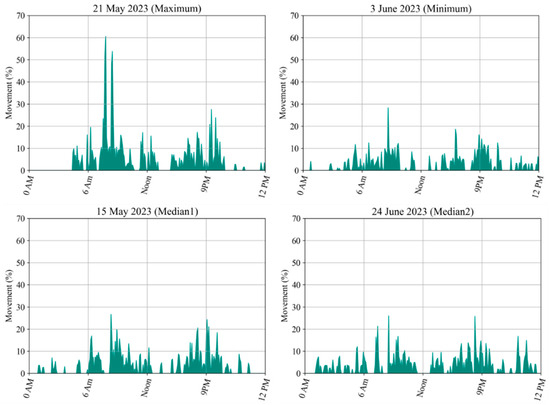 To learn more about the differences in movement activities among the pigs, we selected four days that represent the maximum, minimum, and median movement distances separately for individual analysis (Figure 9). The movement distance on each day was determined from 0 a.m. to 12 p.m. On the day with the maximum movement distance, a unique large displacement was observed at 8 a.m., and the other movements on this day were comparable to those on the other days. However, the pigs did not move near midnight, and the pigs stayed in the same sleeping position at midnight as we observed in the original images. The movement details on these four days indicate that it is common for our pigs to decrease their movement at noon and even stop moving at this time. The movement of the pigs increased during the afternoon, and their walking behaviors usually continued into the night. We can observe in all four subfigures that two common movement peaks occurred at approximately 9 a.m. and 9 p.m.