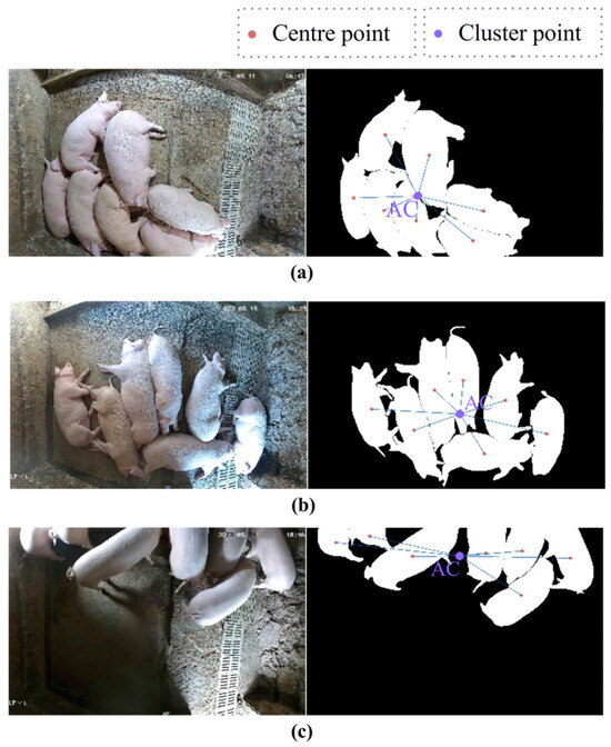 The obtained center points were individually distributed in the scene images. Moreover, independent sporadic pigs are unideal movement monitoring targets. Furthermore, the greater the number of pigs is, the more computation time is needed. Separate points are not promising because they do not reflect the movement status of group-housed pigs. Thus, it is necessary to find a group-housed pig cluster point on the basis of all the pig center points. We collected scattered detected points to define a group of pigs via a clustering algorithm, and a series of variable cluster points represented different movement positions of the group of pigs. The continuous point data of the moving pigs were analyzed to distinguish temporal movement. Supervised clustering algorithms have been used in agricultural fields, such as image segmentation and crop data production [33,34]; however, these algorithms require additional human effort for data classification and dataset labeling. To process the mathematical statistics according to the center location of the group of pigs, considering that this is a two-dimensional coordinate calculation, a fast unsupervised clustering method can be prepared.