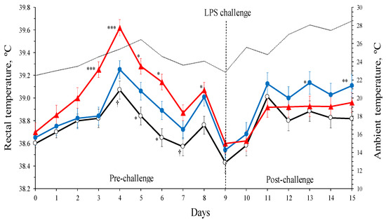Throughout the experiment, daily mean temperatures in the pens gradually increased from 21.2 to 28.5 °C (24.9 °C, on average), whereas relative humidity decreased, oscillating between 38 and 79% (57%, on average). These environmental fluctuations influenced the ewes’ RT values in all three treatments (Figure 1). Positive correlations between ambient and RT temperatures were observed for most data points and treatments during the pre- (r2 = 0.64 to 0.84; p = 0.04 to 0.06) and post-challenge periods (r2 = 0.53 to 0.75; p = 0.04 to 0.21).