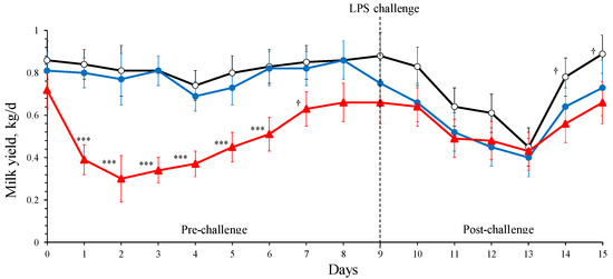 Least-square means (and standard error) of dairy ewes’ milk yield by β-glucans (BG) treatments: ○, control (CON); ●, high-BG barley (HBG); ▲, intraperitoneally injected at d 0 (INP) before and after the lipopolysaccharide (LPS) challenge. Significant differences between least-square means are indicated by symbols: †, p < 0.10; ***, p < 0.001.
