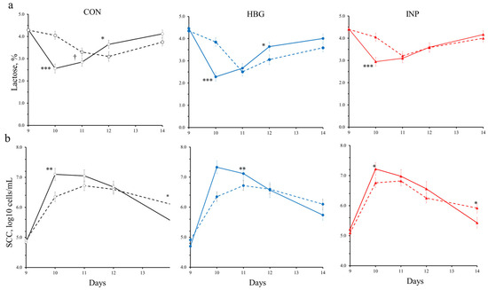 Least-square means (and standard error) of β-glucans (BGs) treatments on (a) lactose and (b) somatic cell count of dairy ewes in late lactation: ○, control (CON); ●, high-BG barley (HBG); ▲, intraperitoneally injected (INP); and according to infusion by udder half (CON-LPS: ○; CON-saline: - -○- -; HBG-LPS: ●; HBG-saline: - -●- -, and INP-LPS: ▲; INP-saline: - -▲- -). Significant differences are indicated by the following: †, p < 0.10; *** p < 0.001: ** p < 0.01: * p < 0.05.