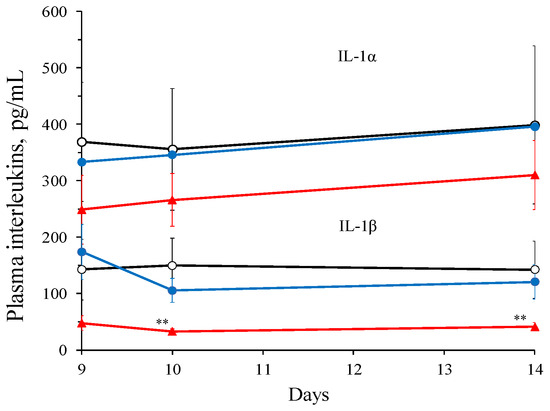 Plasma concentration of IL-α anti- and IL-1ꞵ pro-inflammatory interleukins of dairy ewes according to β-glucans (BGs) treatments: ○, control (CON); ●, high-BG barley (HBG); ▲, intraperitoneally injected (INP); after the lipopolysaccharide (LPS) challenge. Values are LSM, and vertical bars represent SEM (significant differences are indicated by ** p < 0.01).