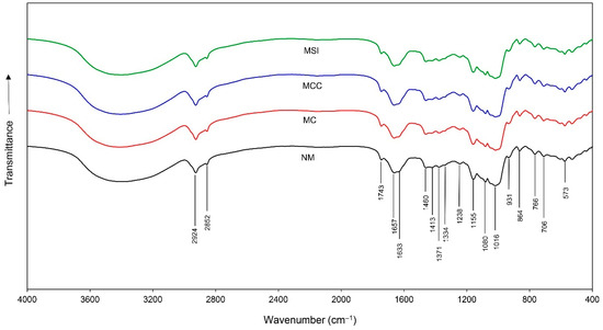FTIR spectra of cattle feed concentrates containing different grade levels of microwaved ingredients. A feed containing non-microwaved ingredients served as the control (NM) while feed concentrates containing microwaved cassava (MC), microwaved cassava and corn meal (MCC), or microwaved solid ingredients (MSIs) served as the experimental groups.