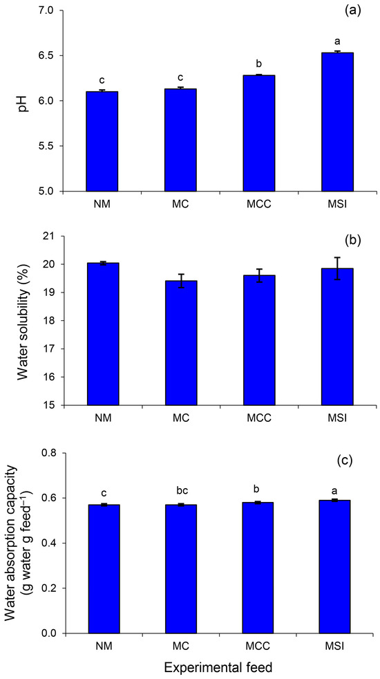 The pH (a), water solubility (b), and water absorption capacity (c) of cattle feed concentrates containing different grade levels of microwaved ingredients. A feed containing non-microwaved ingredients served as the control (NM) while feed concentrates containing microwaved cassava (MC), microwaved cassava and corn meal (MCC), or microwaved solid ingredients (MSIs) served as the experimental groups. Data are expressed as means ± SEM (n = 3). Significant differences between treatments are indicated by different superscripts (p < 0.05).