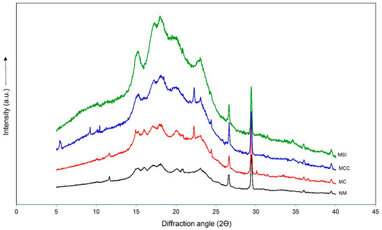 The diffraction patterns of cattle feed concentrates containing different grade levels of microwaved ingredients. A feed concentrate containing non-microwaved ingredients served as the control (NM) while feed concentrates containing microwaved cassava (MC), microwaved cassava and corn meal (MCC), or microwaved solid ingredients (MSIs) served as the experimental groups.