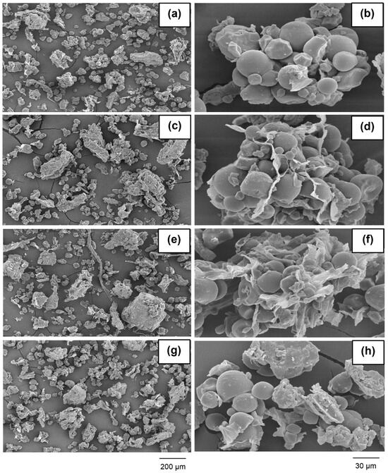 The microstructures of cattle feed concentrates containing different grade levels of microwaved ingredients. A feed containing non-microwaved ingredients served as the control (NM, a,b) while feed concentrates containing microwaved cassava (MC, c,d), microwaved cassava and corn meal (MCC, e,f), or microwaved solid ingredients (MSIs, g,h) served as the experimental groups. The micrographs were recorded at magnifications of 250× (left) and 1500× (right).