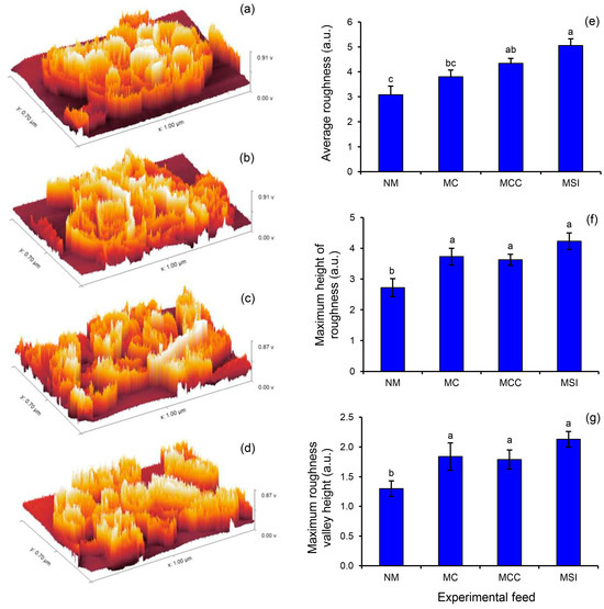 The three-dimensional topography of the cattle feed concentrates containing different grade levels of microwaved ingredients. A feed concentrate containing non-microwaved ingredients served as the control (NM, a) while a feed concentrate containing microwaved cassava (MC, b), microwaved cassava and corn meal (MCC, c), or microwaved solid ingredients (MSIs, d) served as the experimental groups. The topographic parameters were the arithmetic average roughness (e), maximum height of roughness (f), and maximum roughness valley height (g). Data are expressed as means ± SEM (n = 3). Significant differences between treatments are indicated by different superscripts (p < 0.05).
