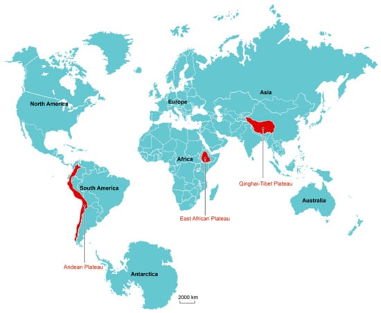 In nature, there is a great variety of organisms with different forms and their respective physiological functions. But any life phenomenon includes four basic characteristics, namely metabolism, excitability, reproduction, and adaptability. Researchers have long been fascinated by the adaptations that high-altitude indigenous animals exhibit in hypoxic environments. Studies have found that most people experience certain physiological, biochemical, anatomical, and clinical changes at altitudes over 3000 m, and some are even affected at 2000 m []. Generally, scientists define altitudes above 2500 m as “high altitude”, at which altitude most people display a fall in arterial O2 saturation (SaO2) []. Worldwide, the major high-altitude regions include the Qinghai-Tibet Plateau, the East African Plateau, and the Andean Plateau [,] (Figure 1). In the 1920s, studies on the hypoxic adaptation of high-altitude aborigines had already appeared, and for almost a century thereafter, the field of high-altitude adaptation was dominated by studies on humans [,,,]. In recent decades, however, studies of high-altitude adaptation in other species that live in a common home with these aborigines have also proliferated [,,,,,,,,].