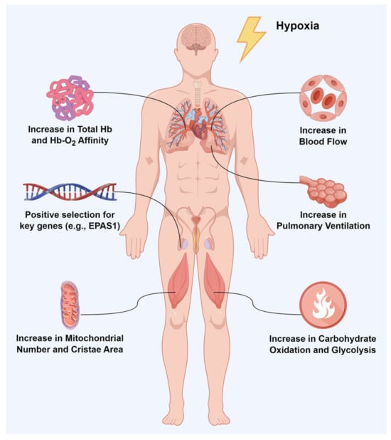 In addition to the pulmonary, cardiovascular, and O2-consuming tissues described above, other systems such as the endocrine system, the central nervous system, and the immune system, as well as their closely related endocannabinoid systems (ECs), also play crucial roles in mediating the complex adaptive responses to hypoxia. The ECs, a complex network of lipid signaling molecules, receptors, and metabolic enzymes, have emerged as a potential mediator of the adaptive response to hypoxia. The ECs can bind to cannabinoid receptors (CB1 and CB2), which are widely distributed throughout the body and regulate various physiological processes []. Recent studies have increasingly shown that the ECs are also involved in the process of hypoxia adaptation. For example, the levels of N-acylethanolamides (NAEs) in the blood of residents living at high altitudes are significantly higher than those in residents living at low altitudes and are associated with increased hemoglobin concentration. This suggests that NAEs, particularly palmitoylethanolamide and oleoylethanolamide, that modulate the ECs, may be involved in the physiological regulation after long-term exposure to high altitudes, such as the increase in erythrocytosis and the enhancement of O2 transport capacity []. In addition, research shows that endurance and resistance exercise can regulate the levels of ECs and receptors in the ECs, as well as the downstream signaling pathways, indicating that the ECs may be involved in the adaptation to exercise in hypoxic environments. However, the regulation of ECs by exercise may differ under normoxic and hypoxic conditions, and its physiological effects need further investigation [].