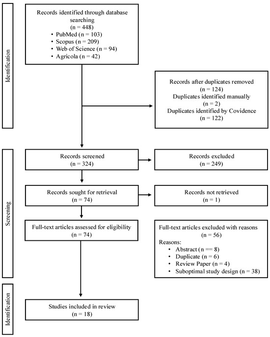 Figure 1 shows the study selection process. The search yielded 448 references in total, from which 124 duplicates were removed. A total of 324 abstracts were then screened, among which 249 were judged ineligible, leaving 74 papers to be read in full text. In total, 18 papers met the eligibility criteria and were included.