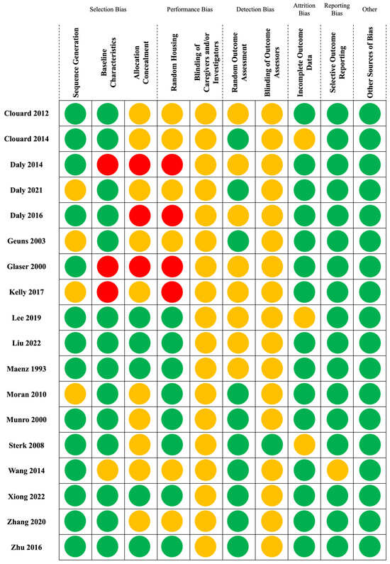 The results of risk of bias assessments of the 18 studies are reported in Figure 2. For sequence generation, most studies had a low risk of bias, ensuring proper randomization [30,31,32,33,34,36,38,39,40,41,42,43,44,45]. Regarding baseline characteristics, the majority of studies reported a low risk of bias, indicating comparable baseline characteristics among groups [29,31,32,33,34,36,37,38,39,40,41,42,43,45]. However, allocation concealment had several studies with unclear or high risk, indicating potential biases in the allocation process [22,29,30,32,33,34,36,37,41,42,44,45]. In terms of random housing, there were instances of both low and high risks, reflecting variability in whether housing was randomized. The blinding of caregivers and/or investigators was often marked by an unclear risk due to insufficient reporting on blinding procedures. For random outcome assessment, this domain was often marked by an unclear risk, with few studies explicitly mentioning random outcome assessment [30,31,32,33,34,39,40,41,42,43,44,45]. Similarly, the blinding of outcome assessors had most studies with an unclear risk. Most studies showed a low risk of bias for incomplete outcome data, indicating proper handling of data acquisition and processing [22,29,30,31,34,36,37,39,40,41,42,43,44,45]. Selective outcome reporting was generally low across studies, suggesting comprehensive reporting of outcomes, except for Wang (2014), which was unclear. All studies were rated as low risk for other sources of bias, indicating minimal other sources of bias.