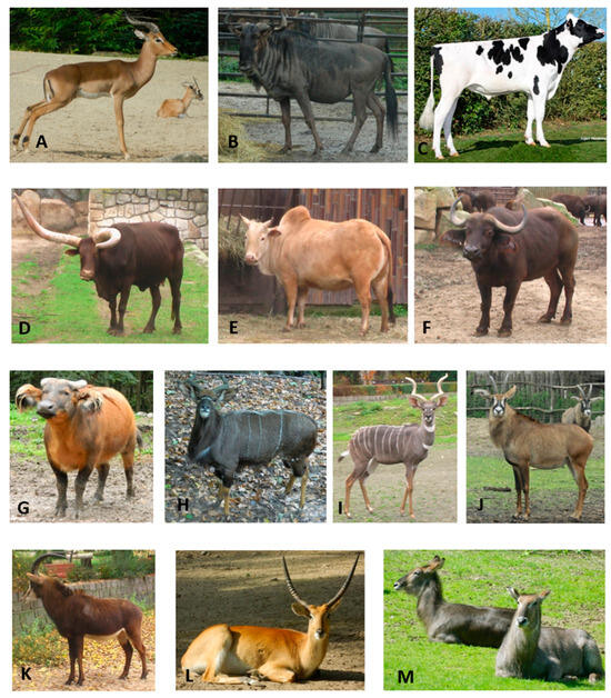 Figure 1. Bovidae taxa included in the analysis of casein gene cluster diversity: (A) impala (Aepyceros melampus), (B) blue wildebeest (Connochaetes taurinus), (C) domestic cattle (Bos taurus taurus, Holstein–Friesian breed), (D) watusi (B. t. taurus), (E) zebu (Bos indicus), (F) African buffalo (Syncerus caffer caffer), (G) African forest buffalo (S. c. nanus), (H) nyala (Tragelaphus angassi), (I) lesser kudu (T. imbersis), (J) roan antelope (Hippotragus equinus), (K) sable antelope (H. niger), (L) red lechwe (Kobus leche), and (M) waterbuck (K. ellipsiprymnus). Photographs: (A,B,DM)—J. Śmiełowski; (C)—M. Marciniak.