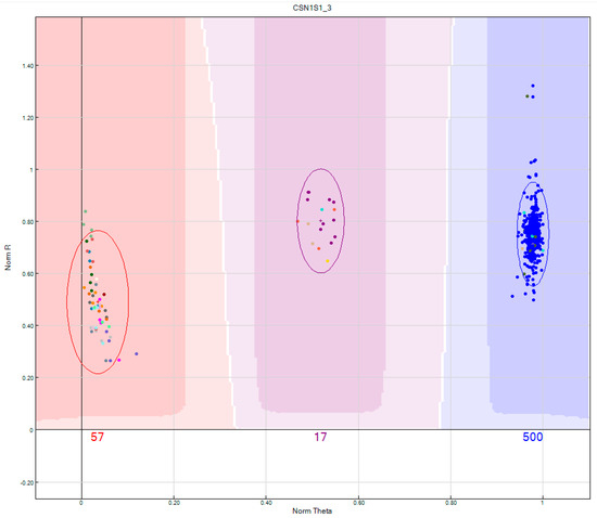 Raw SNP data from the casein gene cluster and surrounding 5′- and 3′-regions, which passed the standard quality control in Illumina Genome Studio software, were inspected using scatter plots (Figure 2). Failed or suboptimal SNPs were excluded from further analyses. After editing, 45,556 SNPs were obtained, including 126 located in the casein gene cluster and within 2 Mb of their 5′-upstream and 3′-downstream regions.