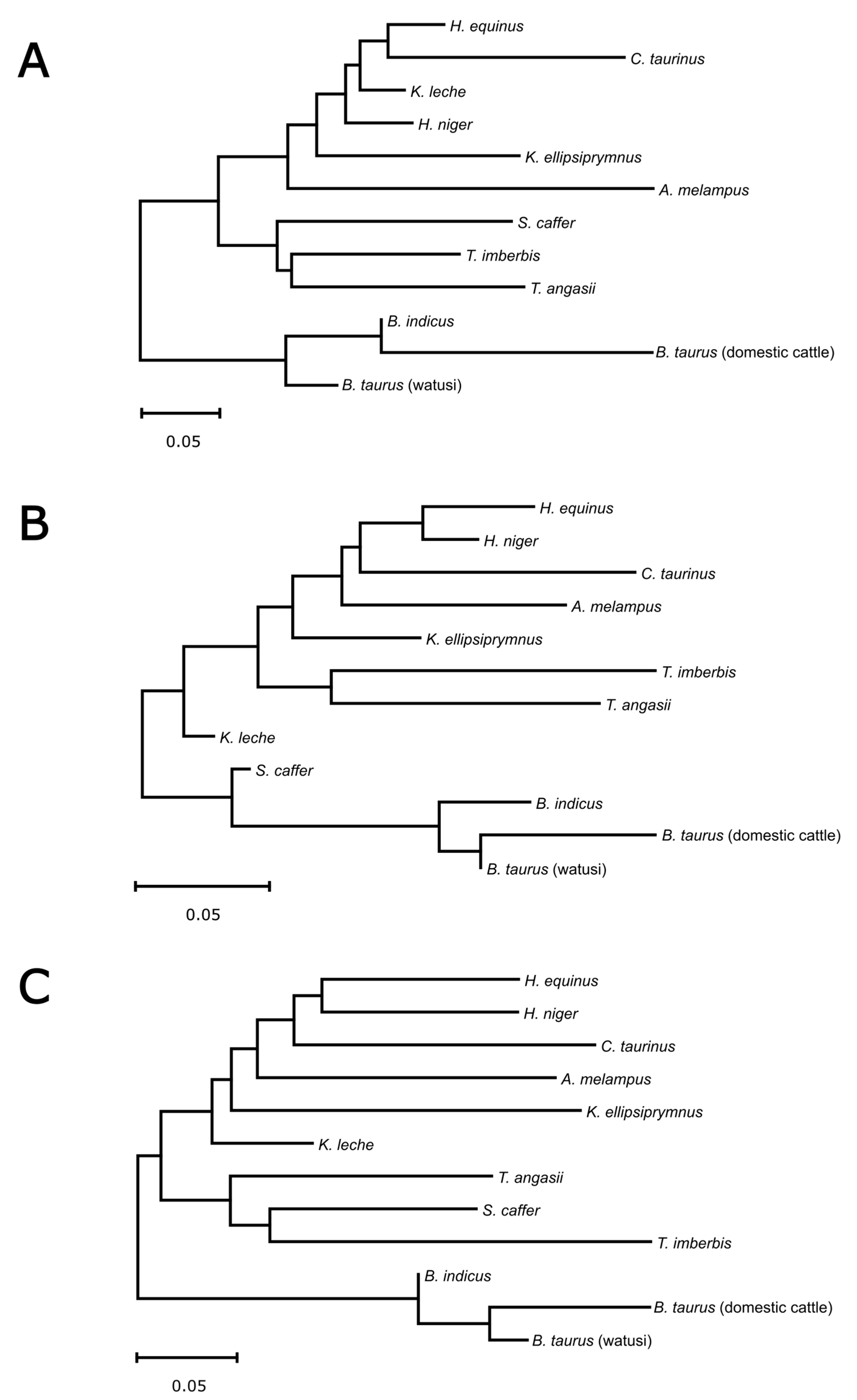 Figure 3. The dendrogram of the Bovidae species based on the Nei unbiased genetic distance inferred from SNPs located in the (A) 5′-upstream region, (B) casein gene cluster, and (C) 3′-downstream region.