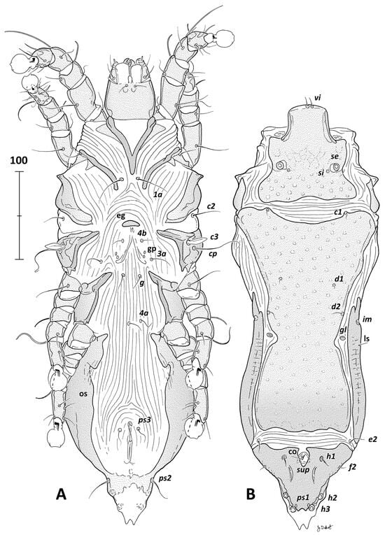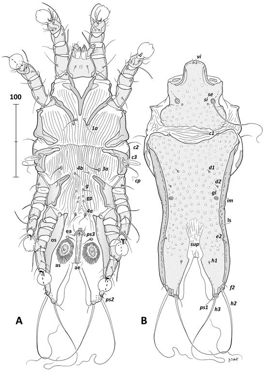 Morphological description of the new species follows recent standards for pterolichid species [36,37,38]. The nomenclature of idiosomal and leg chaetotaxy follows Gaud and Atyeo [4], but in nomenclature for coxal setation, we applied corrections proposed by Norton [39]. Drawings were made with a Leica DM5500 B microscope equipped with DIC illumination (Leica Microsystems Gmbh, Wetzlar, Germany) and a Olympus UD-A camera lucida (Olympus Corp., Tokyo, Japan). All measurements in the text and figures are in micrometres and are based on photos taken by a Leica DFC450 digital camera (Leica Microsystems GmbH, Wetzlar, Germany, 2015) and calculated by LAS v.4.6.1 software (Leica Microsystems GmbH, Wetzlar, Germany, 2015). Photos were made by LAS using Montage Multifocus option and modified in Helicon Focus 8.2.2. Pro software (Helicon Soft Ltd., Kharkiv, Ukraine, 2023).