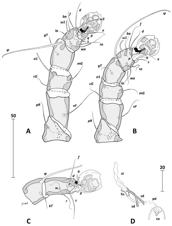 Grallolichus heliornisi sp. n., details. (A)—leg I, male, (B)—leg II, male, (C)—leg IV, male, (D)—spermatheca and spermaducts of female. Abbreviations: hs -head of spermatheca, pd—primary spermaduct, sd—secondary spermaduct, st—spermatheca. Setal designation according to Gaud and Atyeo [4].