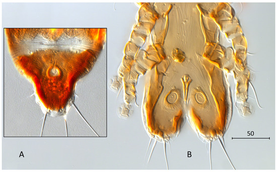 Epimerites I fused into a Y, sternum nearly half of the length of the whole epimerites (Figure 1A). All coxal fields open. Epimerites IVa with lateral shields connected with hysteronotal shield. Opisthoventral sclerites wide, extending from rudimentary epimerites IVa to the level of setae ps2. Genital region without sclerites. Genital organ inserted anterior to the level of setae ps3, three-times closer to these setae than to 4a, and reaching posteriorly the anterior margin of the interlobar cleft. Aedeagus parallel-sided with the same diameter along the whole length, length 42 (40–42), width 6 (5–6) (Figure 1A). Epiandrum bow-shaped. Anal suckers elliptical with large, radiated corollas, corollas length 38 (34–39), width 25 (23–27), distance between centres of suckers 40 (37–41). Setae 4b situated slightly posterior to level of setae 3a. Genital papillae set equidistant to setae g and 4a or slightly closer to g than to 4a. Distances between ventral setae: 4b:3a 15 (13–16), 4b:g 26 (22–27), g:4a 34 (33–37), 4a:ps3 34 (31–34); ps3:ps2 88 (86–87).
