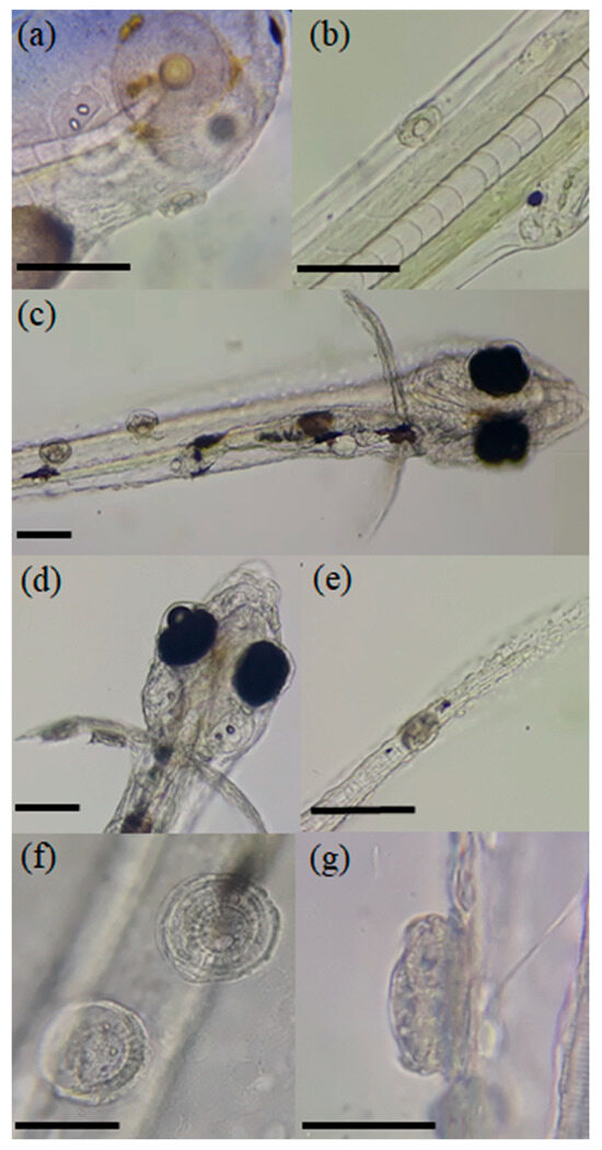 Trichodina infesting larvae of Dormitator latifrons. (a) Head surface of 2-day-post-hatch, infested larvae (dph); (b) dorsal body surface of 2 dph, infested larvae; (c) dorsal view of 6 dph larvae infested with Trichodina; (d) trichodinids adhered to the fins; (e) tail; (f) frontal view of Trichodina; (g) lateral view of Trichodina. Scale 100 µm (a–e), scale 50 µm (f,g).