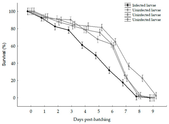 The daily survival rate (S) was calculated using the following equation: S = 100 × (s1/s), where s1 is the daily larval population and s is the initial larval population. The estimate of s1 and s were made using the traditional volumetric method. A statistical analysis for daily survival rate was done with Statistica v.6 software (Stat Soft. Inc., Tulsa, OK, USA). To determine significant differences in daily survival among the infected and the uninfected larvae tanks, an analysis of variance (ANOVA) factorial was performed, after checking the assumptions of normality of the residues and the homogeneity of variances. In the case of finding a difference, the Fisher post-hoc test was used. p values < 0.05 were considered statistically significant.