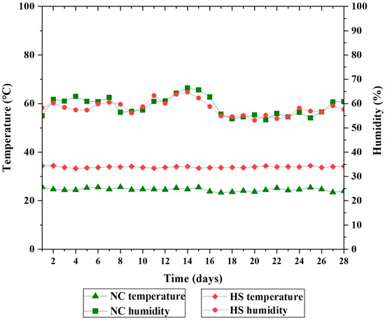 During the trial, the average ambient temperature for the NC treatment and HS treatment groups was 24.59 ± 0.66 °C and 33.86 ± 0.31 °C, and the average relative humidity was 58.65 ± 4.11% and 58.18 ± 3.03%, respectively.