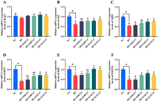 Effects of dietary tributyrin supplementation on the expression of antioxidant-related genes (A) Keap1, (B) Nrf2, (C) NQO1, (D) HO-1, (E) SOD, and (F) GSH-Px, respectively, in the breast muscle of Taihe silky fowls under CHS. NC = normal control treatment; HS = heat stress treatment; HS + 0.04%T = HS treatment supplemented with 0.04% tributyrin; HS + 0.08%T = HS treatment supplemented with 0.08% tributyrin; HS + 0.16%T = HS treatment supplemented with 0.16% tributyrin; HS + 0.32%T = HS treatment supplemented with 0.32% tributyrin. Results are mean value ± standard error. An “*” indicates a significant difference (p < 0.05) for the NC treatment vs. the HS treatment. Mean values with different small letters denote significant differences (p < 0.05) among HS, HS + 0.04% T, HS + 0.08%, HS + 0.16% T, and HS + 0.32% T treatments.