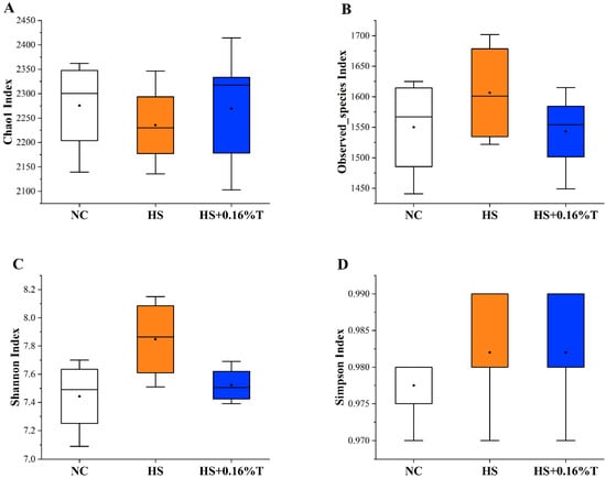 Effects of dietary tributyrin supplementation on the alpha diversity indices representing (A) Chao1 index, (B) Observed species index, (C) Shannon index, (D) Simpson index in the cecum of Taihe silky fowls under CHS. NC = normal control treatment; HS = heat stress treatment; HS + 0.16%T = HS treatment supplemented with 0.16% tributyrin.