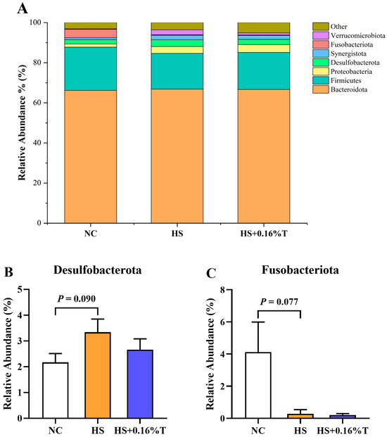 Effects of dietary tributyrin supplementation on the (A) relative abundance of phylum and significant abundance microbiota, namely (B) Desulfobacterota and (C) Fusobacteriota in the cecum of Taihe silky fowls under CHS. NC = normal control treatment; HS = heat stress treatment; HS + 0.16%T = HS treatment supplemented with 0.16% tributyrin.