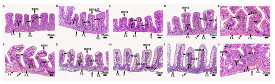Intestinal tissue structure of Brachymystax tsinlingensis. (A) 7 days after hatching (DAH); (B) 10 DAH; (C) 11 DAH; (D) 13 DAH; (E) 19 DAH; (F) 31 DAH; (G) 33 DAH; (H) 39 DAH; (I) 45 DAH; (J) 73 DAH. S: serous; LL: longitudinal layer of smooth muscle; CL: circular layer of smooth muscle; SM: submucosa; LP: lamina propria; GC: goblet cells; BBM: brush border microvillus; IG: intestinal glands.