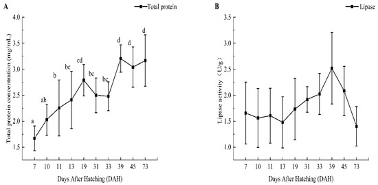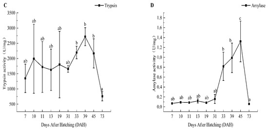 Intestinal digestive enzyme curves of total protein concentration (A), lipase activity (B), trypsin activity (C), and amylase activity (D). Lowercase letters indicate significant differences in digestive enzyme activity (p < 0.05).