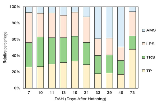 The results demonstrated that the changes in intestinal digestive enzymes in the early development stage of B. tsinlingensis showed an upward trend. The total protein concentration showed an overall upward trend, even after the yolk sac disappeared at the stage of feeding earthworms (19–31 DAH) and at the stage of switching to feed (39–45 DAH). More importantly, there were significant differences between 7 DAH and 11, 13, 19, 31, 33, 39, and 45 DAH (p < 0.05), as the values at 39, 45, and 73 DAH were significantly higher than that at 11 DAH (p < 0.05). LPS activity increased after the mixed trophic period, which decreased after reaching a peak at 39 DAH. Moreover, there was no significant difference between the various stages (p > 0.05). TPS activity showed an upward trend during the exogenous vegetative period and decreased after reaching a peak at 39 DAH. The value at 73 DAH was significantly lower than those at 33, 39, and 45 DAH (p < 0.05). AMS activity showed an upward trend during the exogenous vegetative period and decreased after reaching a peak at 45 DAH. The value at 73 DAH was significantly lower than those at 33, 39, and 45 DAH (p < 0.05), and that at 45 DAH was significantly higher than the value at 7 DAH (p < 0.05). The proportion of AMS increased enormously from 33 DAH to 45 DAH in the early development stage of B. tsinlingensis, but the relative percentage of TRS was relatively stable in the overall amounts of intestinal digestive enzymes during the experiment (Figure 2 and Figure 3).