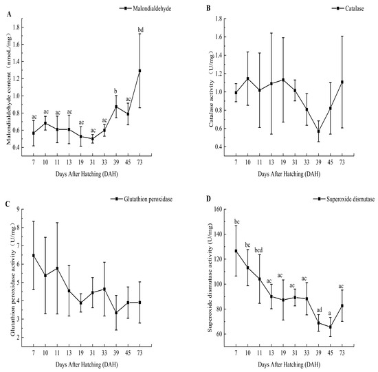 Malondialdehyde content (A) and antioxidant enzyme curve of catalase activity (B), glutathione peroxidase activity (C), and superoxide dismutase activity (D). Lowercase letters indicate significant differences in digestive enzyme activity (p < 0.05).
