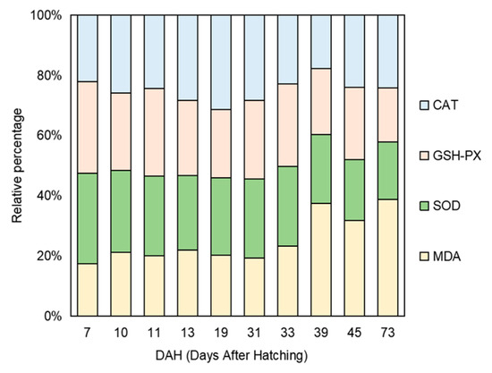 The results showed that the changes in intestinal antioxidant enzymes in the early development stage of B. tsinlingensis were as follows: the content of malondialdehyde showed an overall upward trend, increasing from the disappearance of the yolk sac in the exogenous vegetative period to the stage of feeding earthworms (19–39 DAH) and the feed stage (45–73 DAH); the level at 73 DAH was significantly higher than that at 7, 19, 31, and 39 DAH (p < 0.05). CAT activity decreased after the disappearance of the yolk sac (19 DAH) but increased after reaching the lowest point at 39 DAH, and there was no significant difference in the other groups (p > 0.05). The activity of GSH-Px showed a decreasing trend overall. Specifically, there was an upward trend from the disappearance of the yolk sac to the stage of feeding earthworms (19–33 DAH) and the stage of switching to feed (39–73 DAH) after the disappearance of the yolk sac in the exogenous trophic period, with no significant difference among the phases (p > 0.05). The activity of SOD showed a decreasing trend on the whole. The enzyme activity was slow from the disappearance of the yolk sac to the earthworm feeding stage (19–33 DAH) in the exogenous trophic period. However, the enzyme activity showed an upward trend in the final feed stage (45–73 DAH). There was no significant difference between the groups in the mixed trophic period (13–19 DAH) and the exogenous trophic period (31–73 DAH); the activities at 39 and 45 DAH were significantly lower than those at 7 and 10 DAH (p < 0.05). The relative percentages of the four intestinal antioxidant enzymes were all relatively stable in the overall levels of intestinal digestive enzymes, even at different vegetative periods (Figure 4 and Figure 5).