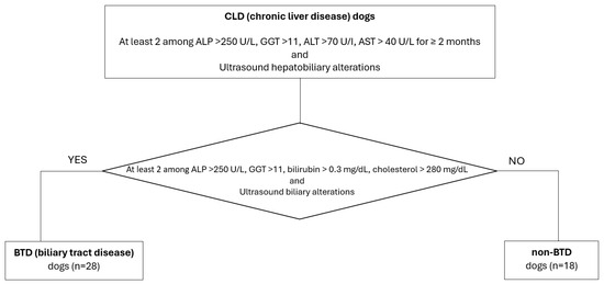 This study was conducted in accordance with the Declaration of Helsinki and approved by the Ethics Committee of the University of Pisa (protocol code n. 41, date of approval: 29 October 2020). Client-owned dogs referred to the Internal Medicine Service of the Veterinary Teaching Hospital of the University of Pisa between January 2020 and January 2023 with a diagnosis of chronic liver disease (CLD) were included. A CLD diagnosis was based on the dog’s medical history, a physical examination, hematology, and blood biochemistry, as well as abdominal ultrasonography. Dogs were prospectively recruited, and the diagnosis of CLD was based on the concurrent presence of persistent increased liver enzymes (>2 months), specifically at least 2 among alkaline phosphatase (ALP) >250 U/L (reference range 45–250 U/L), gamma-glutamyl transferase (GGT) >11 (reference range 2–11 U/L), alanine aminotransferase (ALT) >70 U/I (reference range 20–70 U/L), and aspartate aminotransferase (AST) >40 U/L (reference range 15–40 U/L); ultrasound chronic hepatobiliary alterations, such as hyperechoic parenchyma, abnormalities in the hepatic dimensions and/or margins; the presence of nodular hepatic lesions, referred to as benign hyperplasia; thickened, hyperechoic and irregular gallbladder walls; abnormalities in the gallbladder contents (e.g., mucocele, non-gravity-dependent biliary sludge, cholelithiasis); a chronic intrahepatic biliary tree or common biliary duct dilatation; and mineralization of the intrahepatic biliary tree. Biliary tract disease (BTD) was identified in the case of two or more of the following laboratory alterations: ALP >250 U/L (reference range 45–250 U/L), GGT >11 U/L (reference range 2–11 U/L), total bilirubin >0.3 mg/dL (reference range 0.07–0.3 mg/dL), cholesterol >280 mg/dL (reference range 120–280 mg/dL), and one or more concurrent ultrasonographic biliary tract alterations. According to this classification, the enrolled CLD dogs were divided into subgroups according to biliary tract involvement, specifically BTD and non-BTD (Figure 1). Clinical information, such as ongoing diet and therapies, was registered. Dogs that had received antibiotics, UDCA, probiotics, or synbiotic treatment in the previous 2 months were excluded from the study. All dogs with a history of chronic enteropathy, or with an abdominal ultrasound showing intestinal alterations, were also excluded.