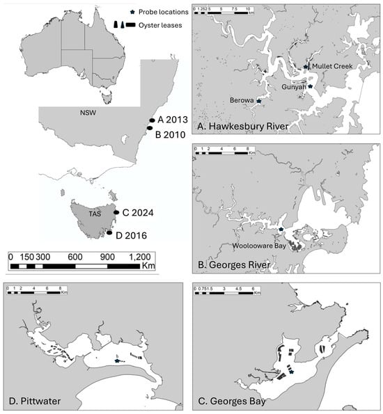 Four distinct mass mortality events form the basis for the present study (Table 1, Figure 1). (1) The first event was the index case for Australia: Oyster farmers at the Georges River estuary, NSW, notified government authorities of mass mortality on 24 November 2010 []. According to the diary records of the farmers, the spat were purchased from a hatchery in Tasmania and placed in the estuary on 16 November 2010. They were checked on 24 November when farmers noticed significant oyster mortalities. (2) The second index case began on 21 January 2013 when farmers at the Hawkesbury River NSW notified authorities of mass mortality []. (3) The third index case began three years later, on 27 January 2016 when farmers in TAS reported mass mortality affecting their oysters [,]. (4) The final index case commenced on 4 February 2024 with the report of mass mortalities in Georges Bay TAS [].