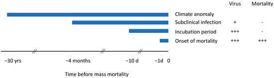Consistent with the conventional understanding of the pathogenesis of infectious diseases and laboratory experiments on the transmission of OsHV-1 [], mortality is preceded by exposure to the virus and an incubation period during which viral loads increase. The definition of incubation period was informed by prior daily observations in experimental infections and field trials in which the reported periods ranged from 1 to 10 days [,,,]. These values include the day of onset of mass mortality. In this paper, the incubation period was defined to commence 10 days before the onset of mass mortality (Table 1).