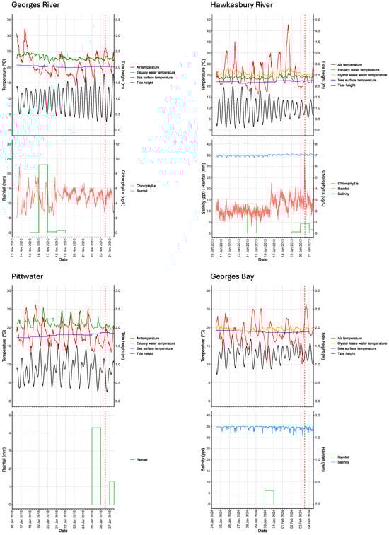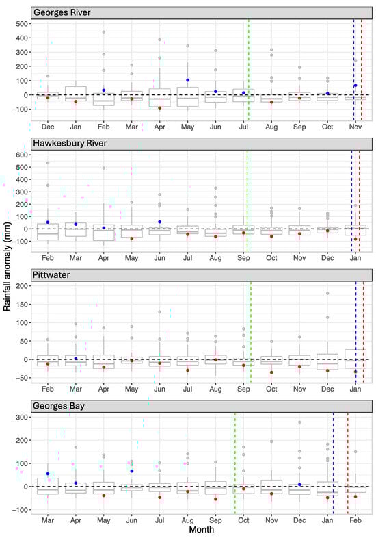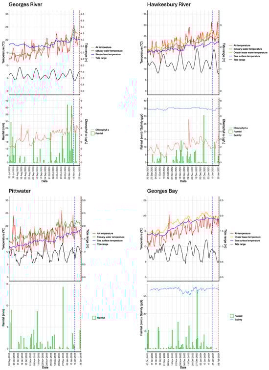 Long-term data for rainfall, minimum, maximum and average air temperature were obtained from the SILO database (https://www.longpaddock.qld.gov.au/silo/) (accessed 1 July 2024) which provides daily (1889—current day) data for a range of climatological variables on a 5 × 5 km grid for the Australian continent []. The data are obtained primarily (>80%) from local weather stations within the 5 × 5 km grid, but in instances where data are missing (non-recorded, instrument failure), they are interpolated from surrounding stations. Data for the Georges River were obtained from the grid centred at latitude −34.00, longitude 151.15; those for the Hawkesbury River at −33.55, 151.25; those for Lower Pittwater at −42.80, 147.60; and those for Georges Bay at −41.30, 148.30.