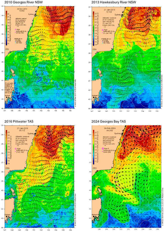 Snapshot sea surface temperatures for each location are shown in Figure 4. At the time of each index case in NSW, there was a warm tail of the south-flowing East Australia current lying offshore Sydney. The temperature of these currents was 23–24 °C on 16 November 2010 and 26–27 °C on 21 January 2013. The southward current travelled closer to the coast until around 500 km north of the Hawkesbury River mouth, and then, separated as it approached the Hawkesbury latitude. Therefore, towards the coastal edge, there was a gradual reduction in temperature of 3 °C for the Georges River 2010 index case and 6 °C for the Hawkesbury River 2013 index case. In January 2016, the East Australia current penetrated much further south; eddies from it reached Bass Strait at 21 °C to 22 °C and flowed down the east coast of Tasmania. However, a band of cooler water 18 °C to 19 °C separated the warmer water from the coast. In February 2024, the East Australia current did not influence the east coast of Tasmania where water temperatures were 18 °C to 19 °C (Figure 4).