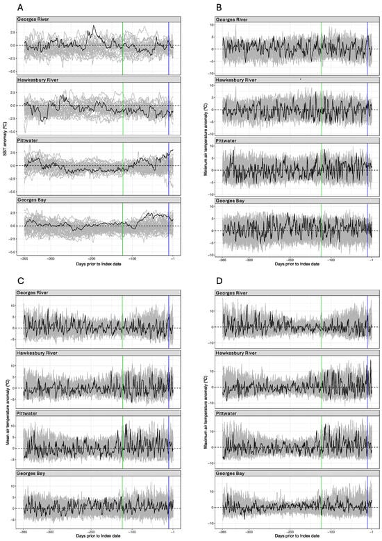 Daily temperature anomalies for the year prior to each index case, with reference to the period from 1 September, 1981: Panel (A), sea surface temperature; Panel (B), minimum air temperature; Panel (C), mean air temperature; Panel (D), maximum air temperature. Black line, daily anomaly for the year immediately prior to the index case that ended at day 0; grey line, daily anomaly for the reference period; vertical green line, start of subclinical infection period; vertical blue line, start of incubation period.